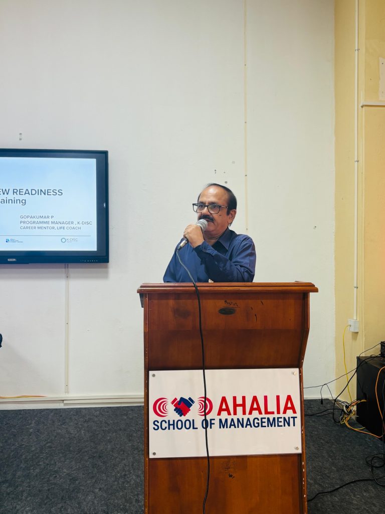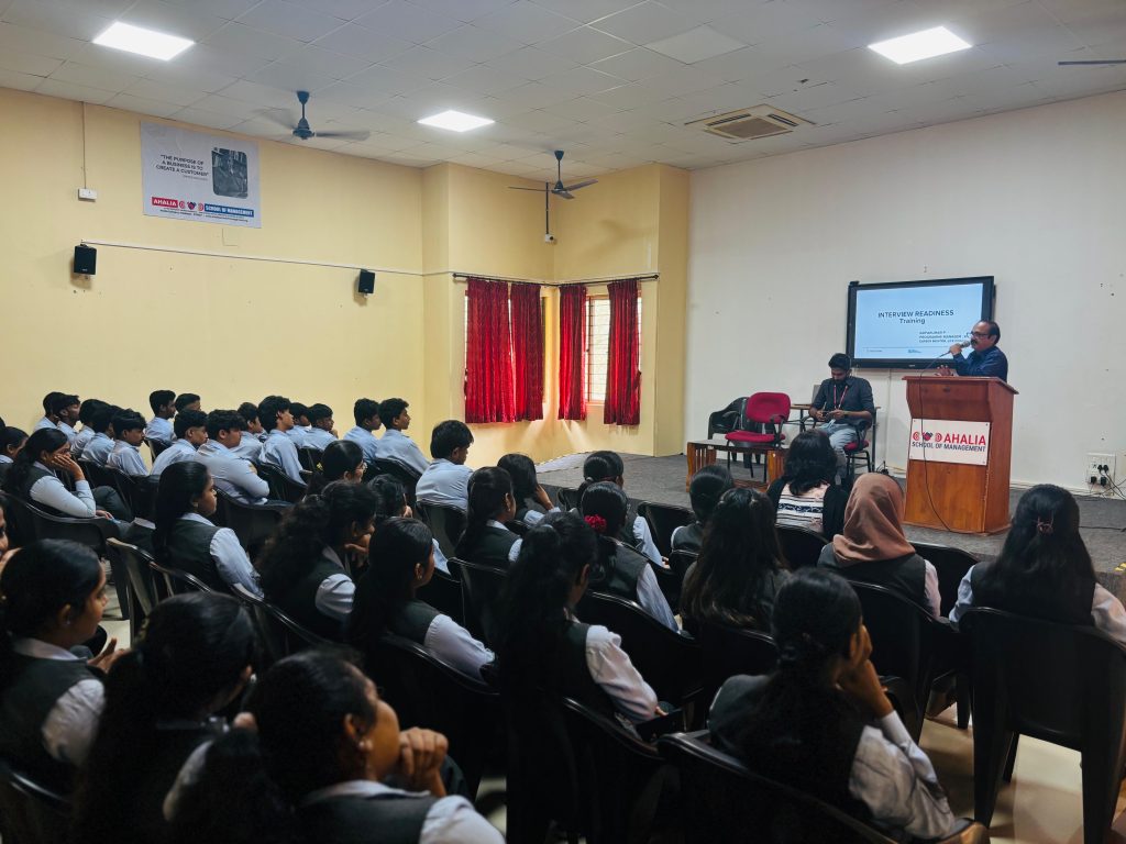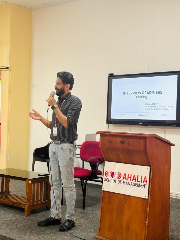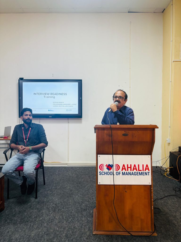 Ahalia School of Commerce and Mathematics conducted a session on Interview Readiness Training on Thursday, 3-July 2025 from 11:00 am onwards at ASCM Seminar Hall for final and pre-final year BBA students. The resource person was Mr. P Gopakumar, Programme Manager, Kerala Development and Innovation Strategic Council (K-DISC). The welcome address was delivered by Dr. S N Jagadeesh, Principal, ASCM.
