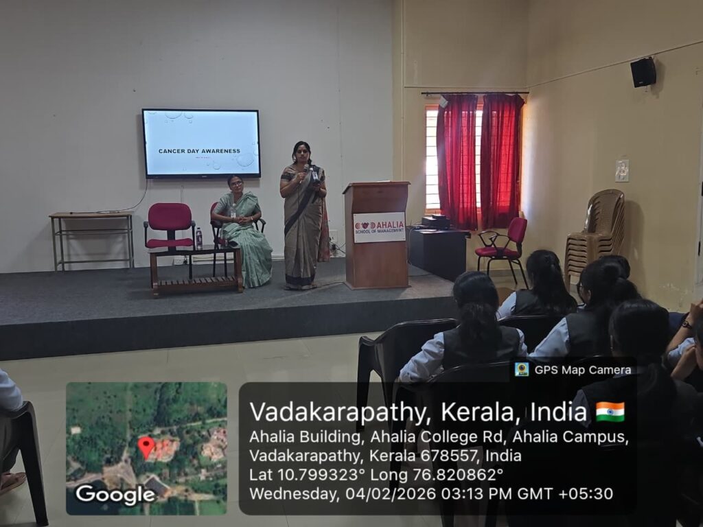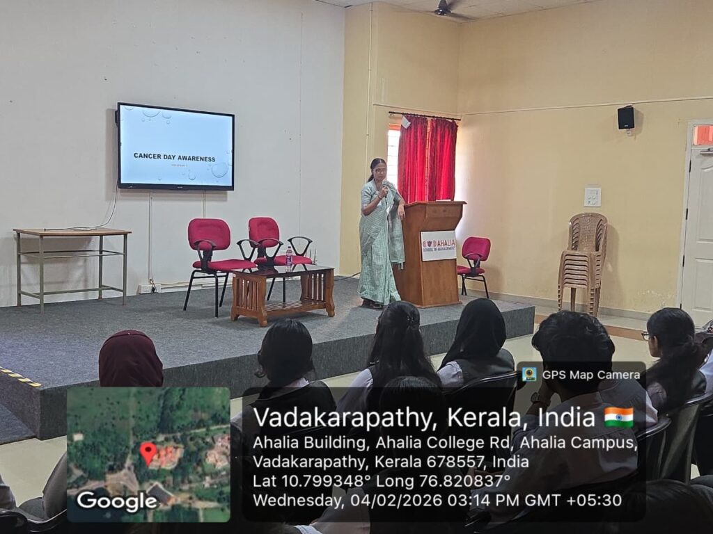 An awareness session on Cancer Detection and Prevention was conducted on 4th February 2026 at the ASCM Seminar Hall as part of World Cancer Day observance by the Ahalia School of Commerce and Mathematics.